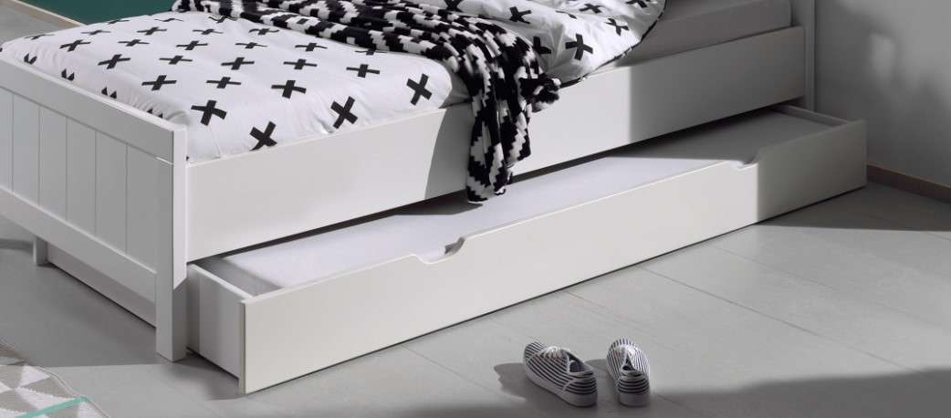 Le tiroir ERIK (90×200) en blanc est fabriqué en MDF laqué en combinaison avec du pin massif. Ce tiroir est compatible avec les lits de la même collection. Vous pouvez utiliser le tiroir comme couchette ou comme rangements.